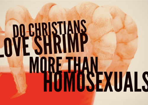 The scene contrasts a group of unhappy, rule-following Bible thumpers with a happy, joyful, and brightly dressed group of normal, irreligious types. Jesus, played by Jack Black, shows up to settle the debate about the Bible and homosexuality. With a shrimp cocktail in hand, he explains that while the Bible may condemn homosexuality, “It says the exact same thing about this shrimp cocktail; Leviticus says shellfish is an abomination.” Black pops a shrimp into his mouth as he sings, “Friend, it seems to me you pick and choose. Well, please choose love instead of hate.”1